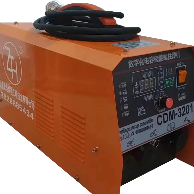 儲能式螺柱焊機可將螺柱、內螺紋螺柱、銷釘?shù)阮愃频脑赣诮饘俟ぜ稀T诤附舆^程中,通過元件尖端放電使儲能電容放電,放電時間0.001-0.003秒,不需要氣體或陶瓷環(huán)保護,熔深約0.1MM。